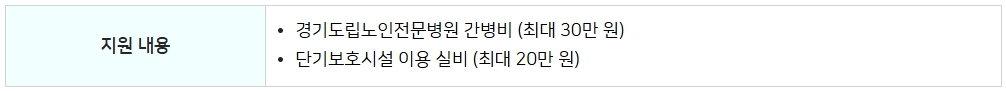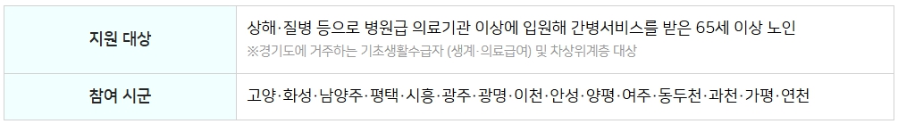 경기도 간병 SOS 프로젝트는 저소득층 65세 이상 노인에게 연간 최대 120만 원의 간병비를 지원합니다. 지원 대상은 경기도에 거주하는 기초생활수급자(생계·의료급여) 및 차상위계층 가운데 상해·질병 등으로 병원급 의료기관 이상에 입원해 간병서비스를 받은 65세 이상 어르신입니다.