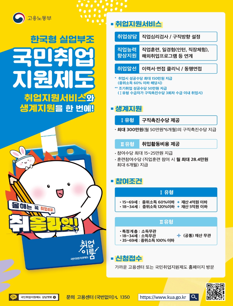 - 1유형 : 취업지원서비스 참여 등 구직활동의무 이행을 전제로 최저생계 보장을 위한 구직촉진수당(50만원x6개월) 지급