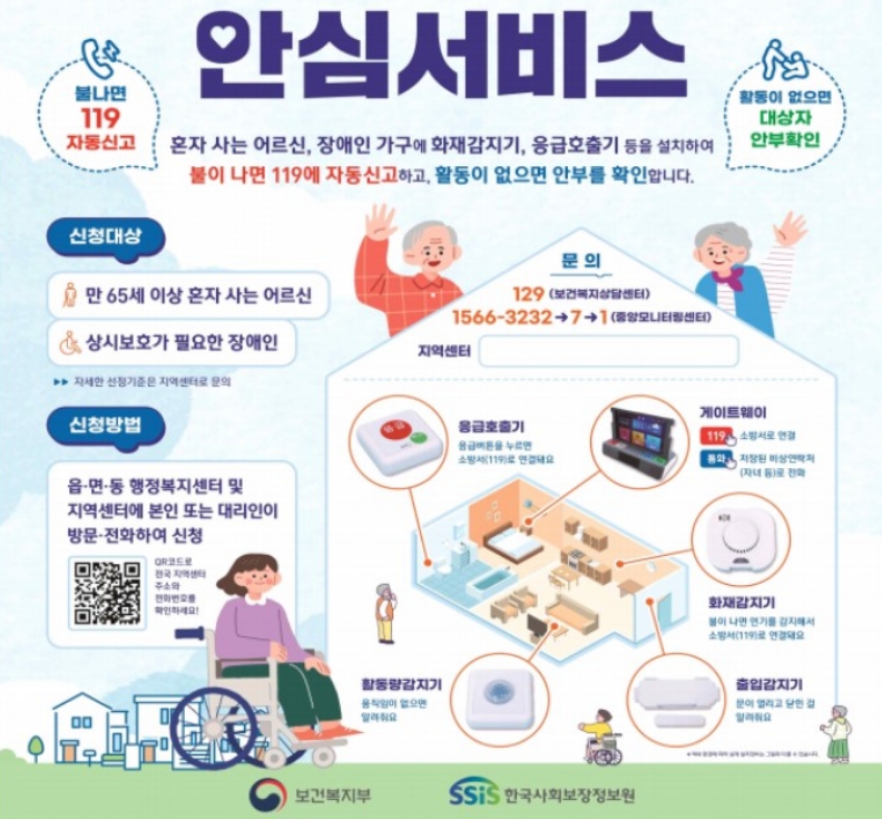 고령자와 장애인을 위한 안전장치로, 혼자 생활하시는 분들의 일상생활은 물론, 화재나 낙상같은 응급 상황에 대비하기 위해 마련된 서비스입니다. 움직임을 실시간으로 감지하여 24시간 지속적인 모니터링을 통해 안전을 확보하며, 움직임이 없거나 위급한 상황이 발생했을 때 설치해 놓은 정보통신기술(ICT) 기반의 장비로 119와 즉시 연결하여 신속하게 대응할 수 있는 서비스입니다. 또한 설치 후에도 정기적인 점검을 통해 정상 작동 여부를 확인하며, 무상으로 설치하여 비용 부담은 전혀 없습니다.