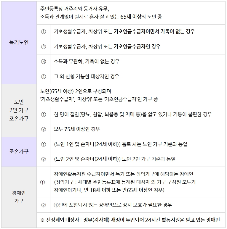 응급안전안심서비스의 지원대상은 만 65세 이상으로 혼자 사는 노인 장애인 등록을 한 분, 기초생활수급자나 차상위계층에 해당하는 분, 기타 지자체장이 필요하다고 판단하는 경우 이러한 기준에 해당하는 분들은 누구나 신청할 수 있으며, 소득 기준이 폐지되어 더 많은 분이 혜택을 받을 수 있게 되었습니다.