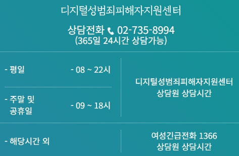 더 많은 정보나 문의 사항은 디지털성범좌피해자지원센터 홈페이지에서 확인 가능합니다