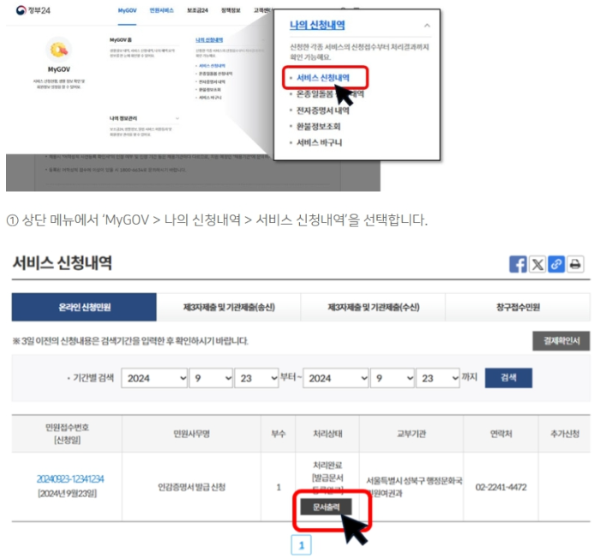 7. 상단 메뉴에서 ‘MyGOV > 나의 신청내역 > 서비스 신청내역’을 선택하고 리스트에서 신청한 내역을 확인하고 증명서를 출력합니다.