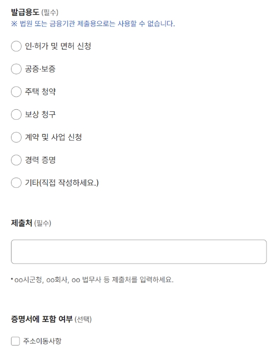 6. 발급용도를 선택하고 제출처를 입력 후 신청하기 버튼 클릭합니다.(법원 또는 금융기관 제출용으로는 사용할 수 없습니다.)