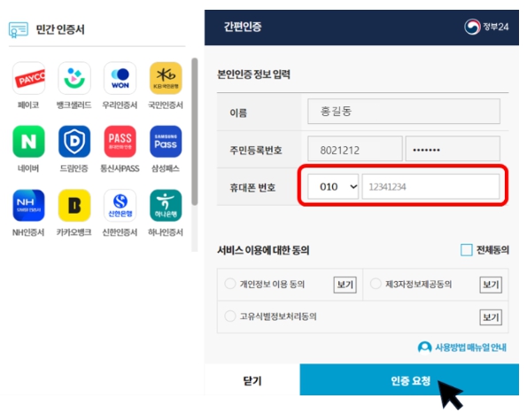 - 복합인증 : 공동 또는 금융인증서 + 휴대폰 본인인증