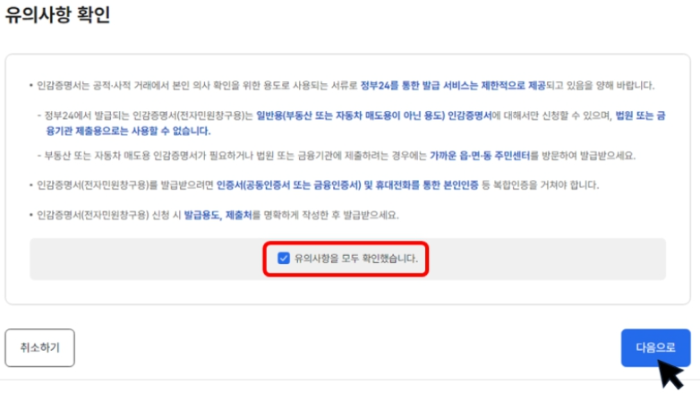 인감증명서는 본인 확인 등을 위해 사용되는 중요문서 이므로 철저한 보안, 개인정보 보호, 도용 방지를 위해 두 번의 본인인증 절차(복합인증)가 필요합니다. 미리 인증서를 준비하면 쉽게 진행할 수 있습니다.
