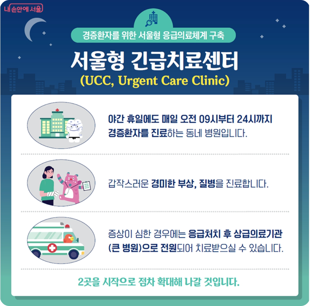 - 야간과 휴일에 매일 오전 9시부터 24시까지 갑작스러운 경미한 부상, 질병 등에 경증 환자를 진료하며 증상이 심할 때는 응급 처치 후 큰 병원으로 이동하여 치료받을 수 있습니다.