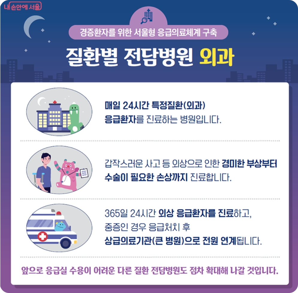 - 서울형 질환별 전담병원에는 강서구 원탑병원, 마포구 서울연세병원, 광진구 서울프라임병원, 강동구 리더스병원 등 외과 계열 질환 전담병원 4곳을 시작으로 안과 산부인과 등 다른 질환에 대한 전담병원도 확대할 예정이라고 합니다.