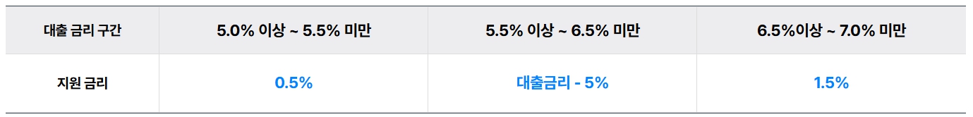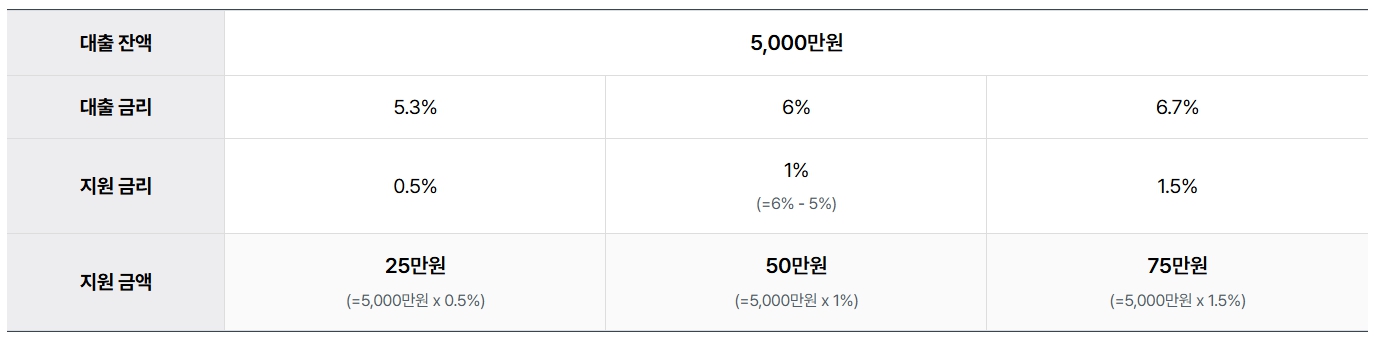 - 대출잔액 × 금리 구간에 따른 지원 이자율(0.5% ~ 1.5%)