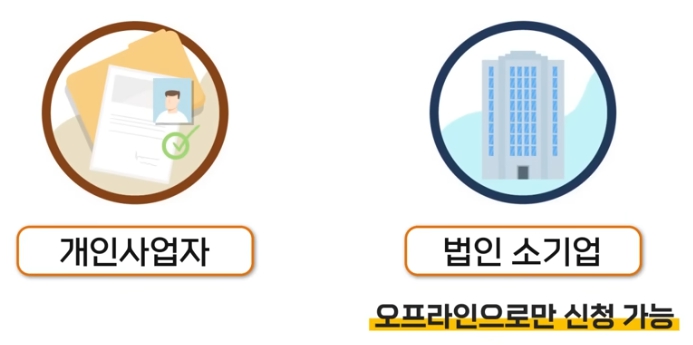 - 개인사업자만 온라인으로 신청할 수 있으며, 온라인 신청시에는 별도 서류를 제출하지 않아도 됩니다.