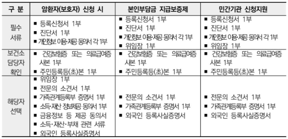 ※ 암환자의 보건소 방문이 어려운 경우, 담당자와 협의 후 등기 또는 메일을 통한 신청도 인정합니다. 다만, 자격 확인 유무 등 방문 접수가 필요할 수 있습니다, (소아 소득, 재산 조사 등)
