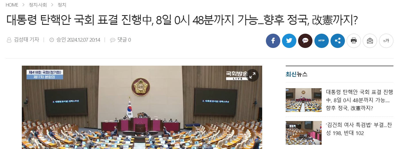 오늘은 대한민국 국민뿐만 아니라 세계의 모든 시선이 대한민국 국회에 집중되는 하루입니다. 오늘에 상황에 따라 나라의 운명이 달라질 수 있는 중요한 날일 것입니다. 불안하게 일상을 보내느냐, 빨리 복잡한 상황을 정리하고 평범한 일상으로 돌아갈 것이냐, 좀 전까지는 걱정이 많았지만 지금은 무서워 지기까지 합니다. 국회의원들은 8일 0시 48분까지 투표할 시간이 있다고 합니다. 대의 민주주의 대표 기관이며 개개인이 입법기관인 국회의원들은 본인의 소신을 찬성이든 반대든 투표권을 버리지 말고 당당하게 본인의 의사를 표현할 수 있는 투표는 해야 할 것입니다.