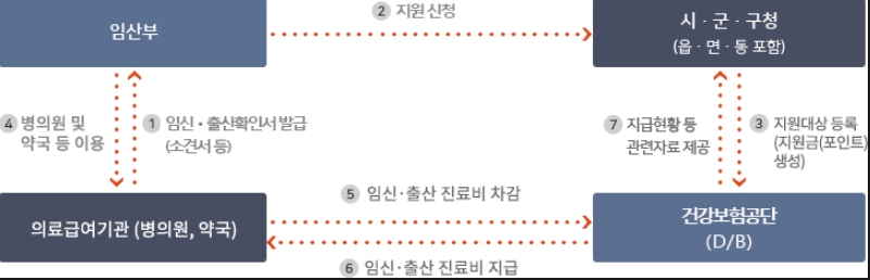 - 주민센터 보건소: 기관 내에 비치되어 있는 임신서비스 통합처리 신청서 작성 후 전문의의 임신사실을 확인받은 건강보험 임신, 출산 진료비 지급신청서 첨부제출