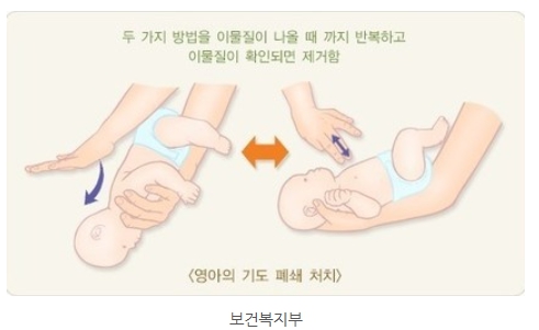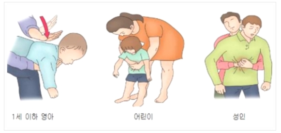 - 기도에 음식이 걸리면 기침 유도 후 하임리히법 시행하기 : 기침을 할 수 없을 만큼 위급하다면 뒤에 서서 허리를 팔로 감고 주먹 쥔 손을 명치 아래에 놓고 빠르게 위로 밀쳐 올립니다. 만약 어린아이일 경우는 아이 얼굴이 아래로 향하도록 하고 손바닥으로 아이 어깨뼈 사이에 있는 등을 5회 정도 두드려 줍니다. 그리고 앞으로 돌려 가슴 한가운데를 5회 압박하고 입안에 있는 이물질을 제거해 줍니다. 혹시 아이가 이물질을 삼켰을 때는 손가락을 임안 측면으로 깊숙이 넣은 다음에 밖으로 훑어냅니다. 이물질이 눈에 안보이거나 깊숙이 있을 때는 건드리지 말고 바로 병원을 찾아야 합니다.