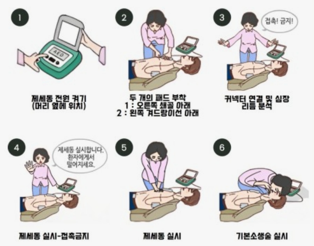 - 도움 요청 : 즉시 119에 신고하고 AED(자동 제세동기)를 요청합니다.