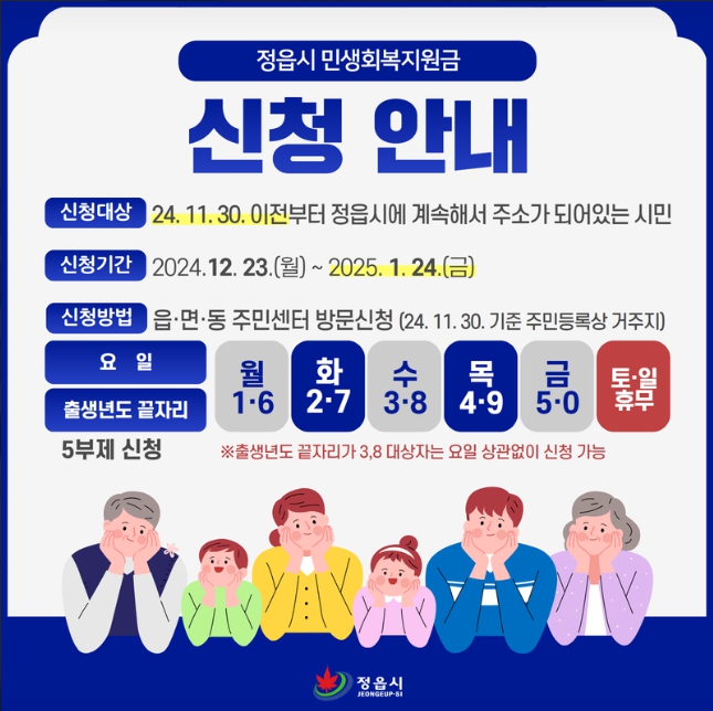 ● 정읍시민들의 민생 안정 및 지역경제 활성화를 위해 정읍시 민생회복지원금을 지급합니다. 12월 23일 월요일부터 2025년 1월 24일 금요일까지 주소지 읍면동 주민센터에 신청할 수 있으며 출생년도 끝자리 기준 5부제로 월요일에는 출생년도 끝자리가 1과 6, 화요일에는 2와 7, 수요일에는 3과 8, 목요일에는 4와 9, 금요일에는 5와 0인 사람이 신청하면 됩니다. 출생년도 끝자리가 3, 8 대상자는 요일 상관없이 신청할 수 있습니다.