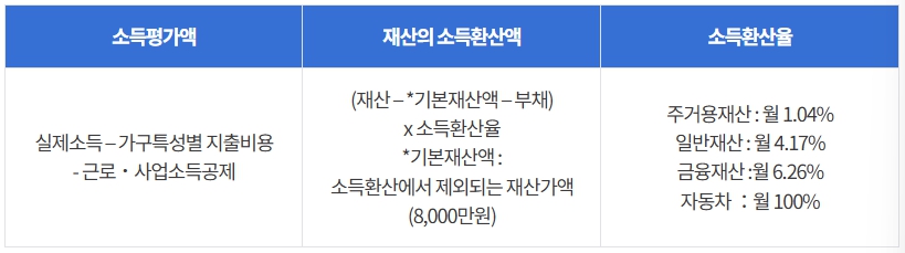 - 소득인정액이란 현재 소득과 소유하고 있는 재산을 일정한 비율로 환산한 금액으로 그 가구의 전체적인 생활 수준을 평가합니다.