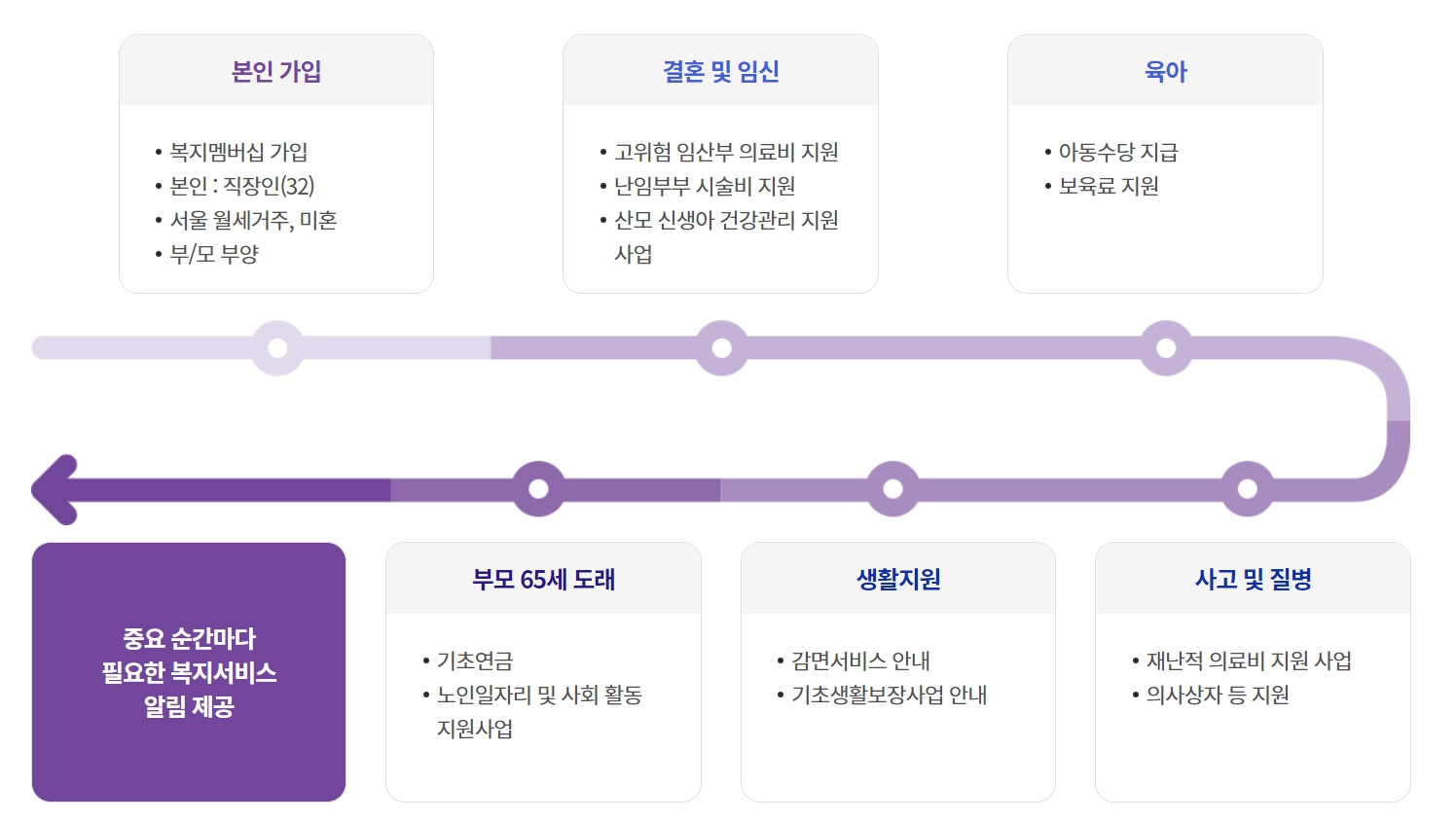 신청인의 결혼, 출산, 육아, 질병 발생 등과 같은 생애 이벤트가 발생하면, 경제 수준의 변동, 신규제도의 도입 시 수시로 받을 수 있는 사업을 조사하여 문자나 이메일로 알려줍니다.