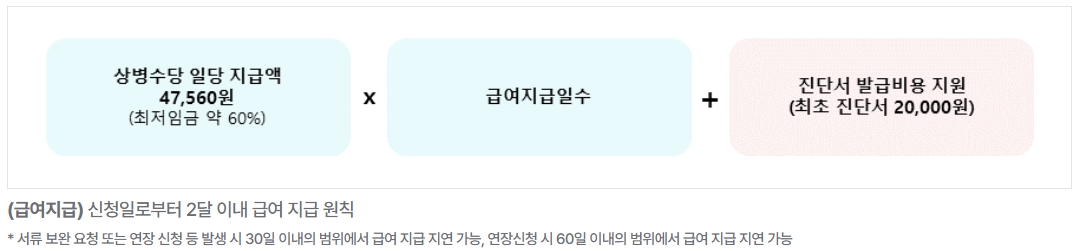 업무와 무관한 질병, 부상으로 연속 7일 이상 일을 하지 못하면 1일 47,560원 최대 150일까지 지급하며 1인당 150일 최대 7,134,000원을 지급합니다.