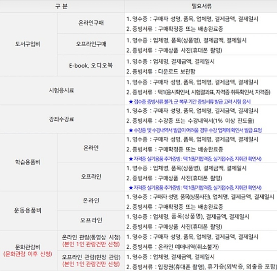 - 문화관람비 : 영화, 뮤지컬, 콘서트, 스포츠 관람 등 다양한 문화 관람 활동에 사용 - 놀이공원이나 아쿠아리움 방문은 지원 대상이 아닙니다.