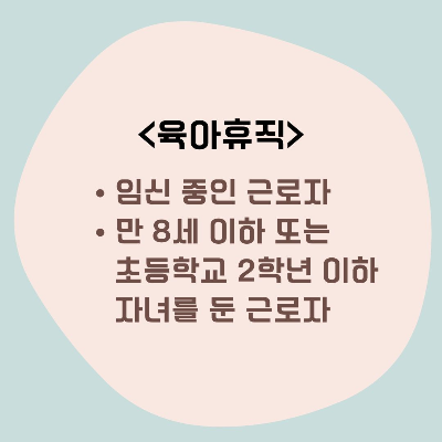 ● 임신 중인 여성 근로자이거나, 만 8세 이하 또는 초등학교 2학년 이하의 자녀를 둔 근로자가 자녀를 양육하기 위해 신청하는 휴직으로, 근로자의 육아부담을 해소하고 일·가정 양립을 지원합니다. (최대 1년)