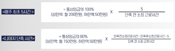 - 나머지 단축 시간: 통상임금의 80% × (단축 전 소정 근로시간-단축 후 소정 근로시간-5/단축 전 소정 근로시간) (상한액: 월 150만원, 하한액: 50만원).
