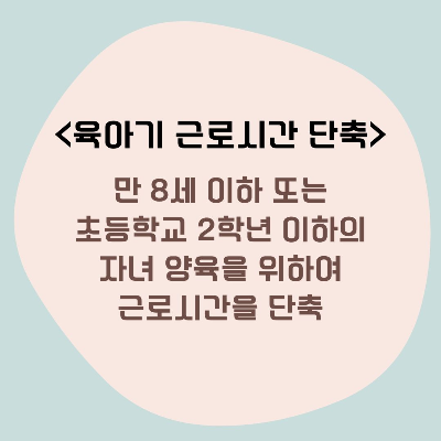 ● 근로자가 만 8세 이하 또는 초등학교 2학년 이하의 자녀 양육을 위하여 근로시간을 단축함으로써 일·가정 양립과 경력단절을 방지토록 하는 제도입니다. (1년, 육아휴직 미사용기간 가산 시 최대 2년)