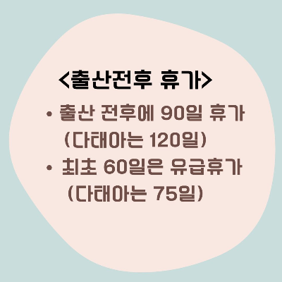 ● 임신한 근로자는 출산 전후에 90일(다태아는 120일)의 휴가를 사용할 수 있으며, 이 중 최초 60일(다태아는 75일)은 유급휴가로 보장됩니다.
