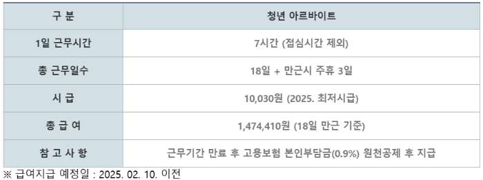 ● 급여조건 : 1일 7시간근무 (점심시간 제외) / 근무일 18일 + 만근시 주휴 3일 / 시급 10,030원(2025년 최저시급 기준)\