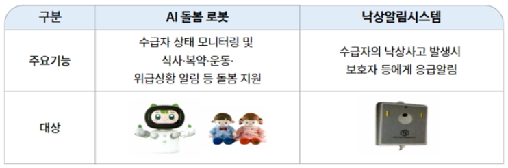 - AI 돌봄 로봇: 수급자 상태 모니터링 및 식사, 복약, 운동, 위급상황 알림 등 돌봄 지원