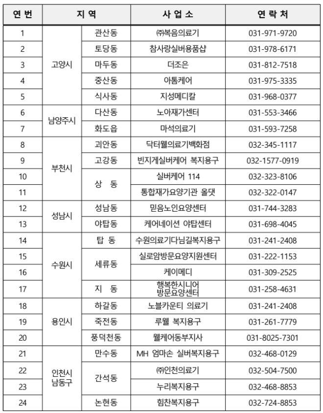실거주지 주소가 시범사업 지역으로 등록되어 있는 장기요양 재가 수급자라면 2024년 9월부터 2025년 8월까지 12개월간 시범사업에 참여하는 24개 복지용구사업소에서 해당 품목을 구입할 수 있으며 수급자 1인당 복지용구 연 한도액인 160만원 내에서 이용(구입)을 지원합니다. (본인부담률 30%)